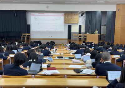 第1回は、明治学院大学 教養教育センターの長谷部美佳先生をお迎えし、講義全体のオリエンテーションが行われました。講義の進め方についての説明に加え、大学の学習管理システムを実際に使用する体験も行いました。生徒たちはシステムを通して長谷部先生に質問を送り、先生から一つひとつ丁寧にご回答いただきました。