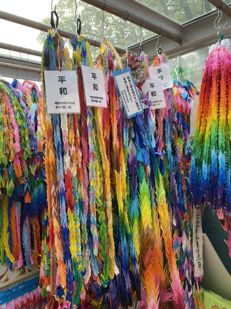 朝、原爆ドーム前で早天礼拝をおこないました。朝食後、広島の宿舎をチェックアウトし、「原爆の子の像」に折り鶴を奉納しました。今回は3年ぶりに研修旅行をすることができましたので、一昨年度の中3(現高2)と昨年度の中3(現高1)が作った千羽鶴も一緒に奉納することが出来ました。さらに袋町小学校と本川小学校の被爆校舎見学し、広島から京都に移動しました。京都駅に到着後、班別研修をおこないました。この日は金閣寺や竜安寺、清水寺、銀閣寺、天龍寺など、京都市内の寺社を見学し、宿舎にチェックインしました。